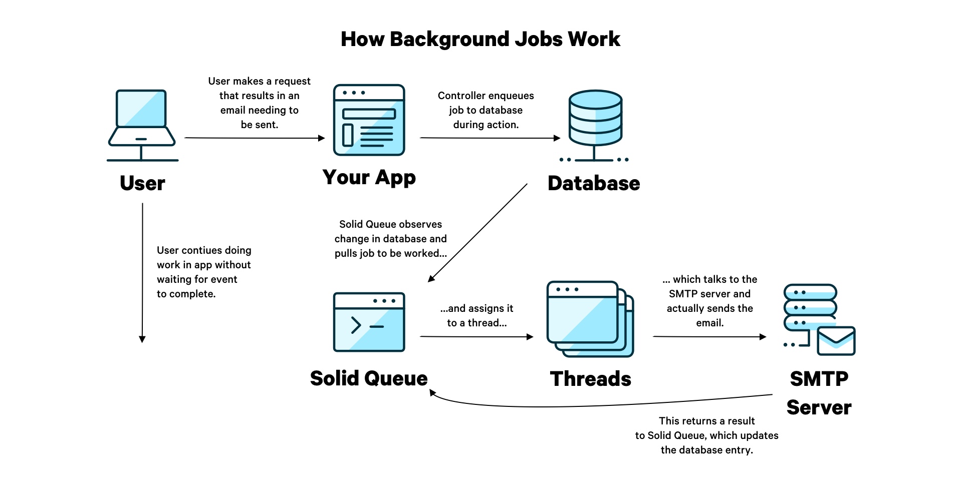 To make background jobs more robust, Rails uses solid_queue for production environments. Solid Queue stores jobs in the database and executes them in a separate process.